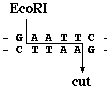 For example, let’s follow a particular RFLP that is defined by the restriction enzyme EcoR I and the target sequence of 20 bases GCATGCATGCATGCATGCAT. EcoR I binds to its recognition seuqence GAATTC and cuts the double-stranded DNA as shown: