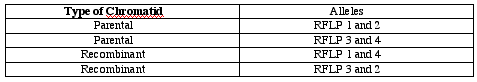 The male can only produce one type of gamete (1 and 2) but the female can produce four different gametes. Two of the possible four are called parental because they carry both RFLP bands from the same chromosome; 1 and 2 from the left chromosome or 3 and 4 from the right chromosome. The other two chromosomes are recombinant because recombination has occurred between the two loci and thus the RFLP bands are mixed so that 1 is now linked to 4 and 3 is linked to 2.