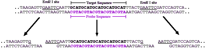 In the segement of DNA shown below, you can see the elements of an RFLP; a target sequence flanked by a pair of restriction sites. When this segment of DNA is cut by EcoR I, three restriction fragments are produced, but only one contains the target sequence which can be bound by the complementary probe sequence (purple).