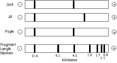 Therefore, when Jack and Jill have their DNA subject to RFLP analysis, they will have one band in common and one band that does not match the other’s in molecular weight: