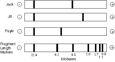 In this case, it appears that Jack could be the father, since Payle inherited the 12.4 kb fragment from Jill and the 4.3 fragment from Jack. However, it is possible that another man with similar RFLP pattern could be as well.To be certain, several more RFLP loci would be tested. It would be highly unlikely that two men (other than identical twins) would share multiple RFLP patterns and so paternity could be confirmed.