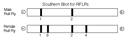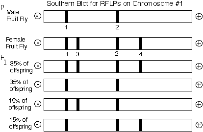 When these two flies mate, the frequency of the four possible progeny can be measured and from this information, the genetic distance between the two RFLP loci (upper and lower) can be determined.
